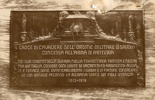 Data/Periodo: Primo dopoguerra Note Monumento: Targa fusa nel bronzo nemico. Croce di cavaliere dell'ordine militare di Savoia concessa all'arma di fanteria